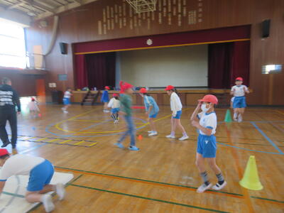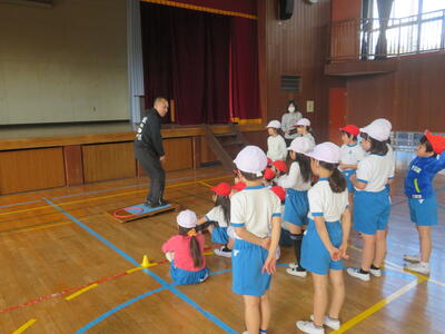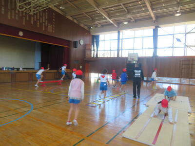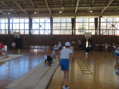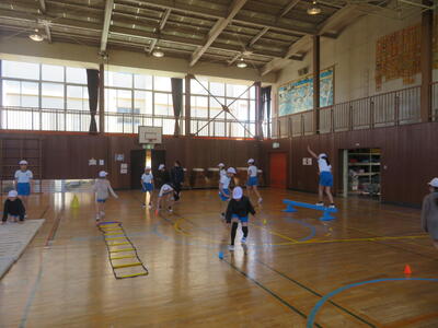 4日に、体育サポート教室を4年生と2年生が実施しました。マット、コーン、ラダー、平均台など様々な器具を使って体を動かす楽しさを味わっていました。