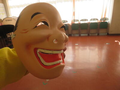 3年生の様子、逆井囃子で使うお面を見せてくださいました↓