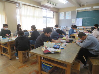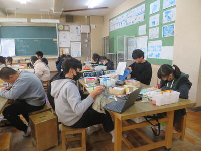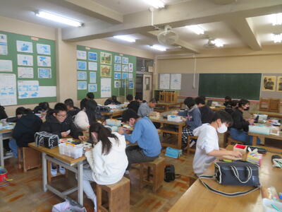 6年生が図画工作科で、オルゴール箱づくりに取り組んでいます。中学校には図画工作科という教科はないのでこの学習が子どもたちにとっては最後の図画工作科の作品となります。皆、それぞれ思い描いたデザインを彫って、作品作りに取り組んでいました。
