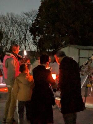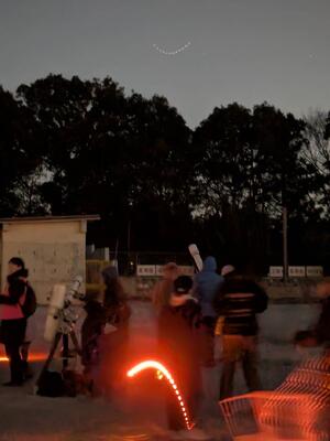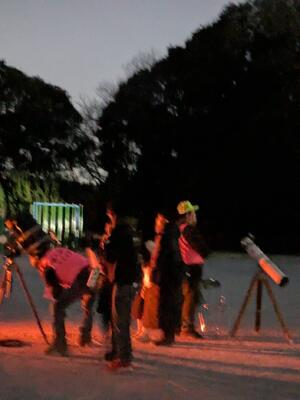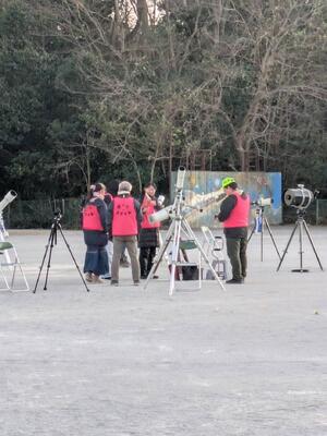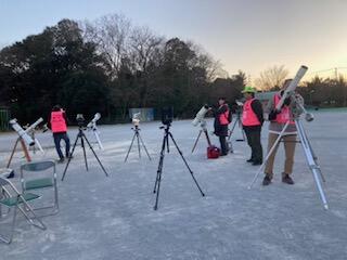 22日(土)に荒天のため延期となっていた逆小スマイル(逆井小学校学校運営協議会)主催の冬の星空観察会が開かれました。たくさんの望遠鏡が準備され、いつもとは違う校庭になっていました。