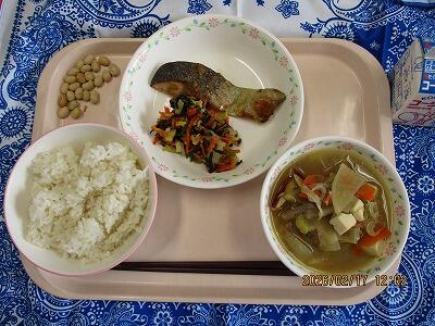 ごはん 鮭のごま酢かけ 白菜ののり和え スキー汁 いり大豆