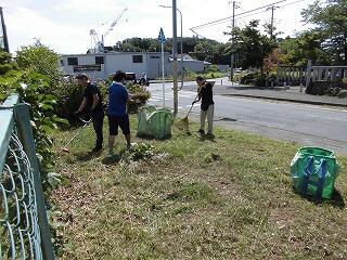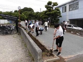 虫が出てきてキャーキャー騒いでいる生徒、普段家でやっているとのことで、得意げに草取りする生徒、分担が終わると次の場所を積極的に探す生徒と様々です。ただ大勢の生徒が集まってくれたおかげで、30~40分ですっかりきれいになり、花植えの準備は完了です。6月7日、15日の2日間をかけて行う次の花植えがとても楽しみです。