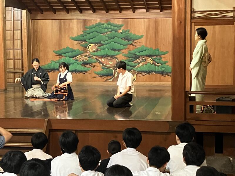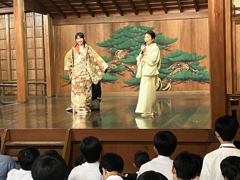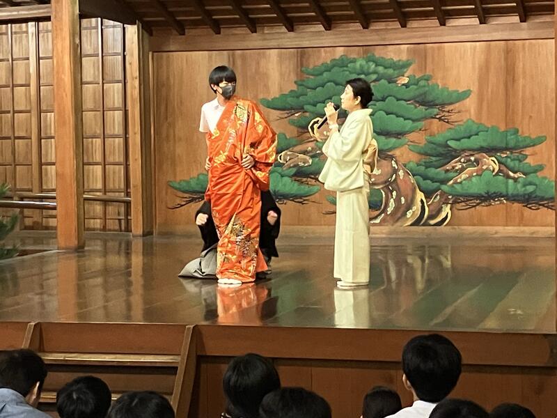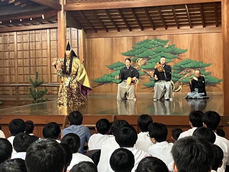 能の説明や、代表者が所作等の体験をさせていただいた事に続いて、実際の能を鑑賞することができました。最後にお礼として皆が心を1つにして歌った「名づけられた葉」の合唱はとても素晴らしかったですね。