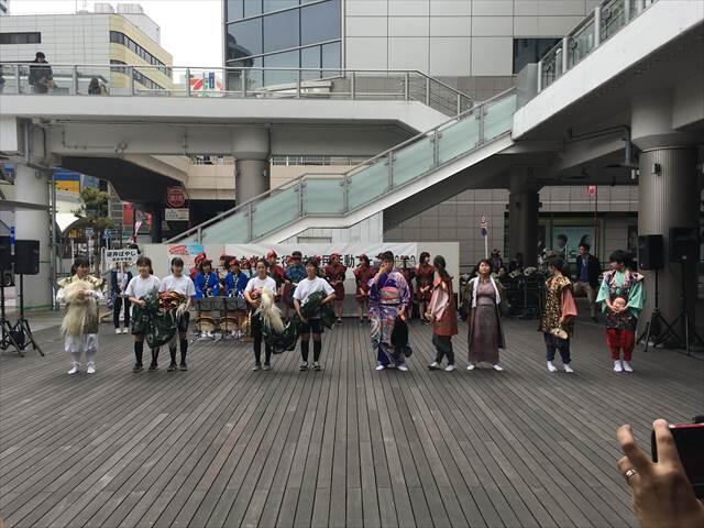 5月13日(日)柏市民フェスタが開催され、本校の逆井囃子が招待され発表を行いました。当日は前日の夏のような暑さも収まり、気持ち良い天気のもと実施されました。柏駅近くの丸井1階入り口前のデッキで、オープニングとして発表しました。その後柏駅前のダブルデッキ上に移動して再度発表しました。通りがかりの人たちが足を止め熱心に見入ってくださいました。