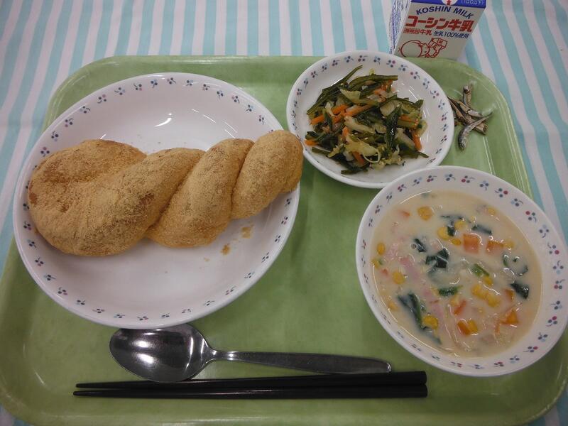 一覧へ きなこ揚げパン 日時 2025年10月01日(水) 公開対象 給食の献立 詳細 牛乳 きなこ揚げパン 豆乳入りコーンポタージュ 茎わかめのサラダ 小魚 作成者 逆井中学校管理者 更新日時 2025-10-01 15:34:53