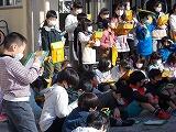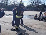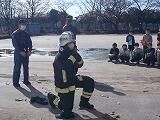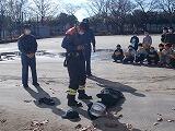 さらに,出動する際に早着替えを実際にやって見せてくださいました。およそ40秒で防火服を着用できるように,日々訓練を続けているそうです。見守る「やなぎっ子」からは,応援や驚きの喚声があがりました。日頃から,地域の安全を守るために訓練を続けていることがよくわかりました。