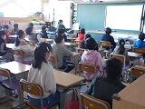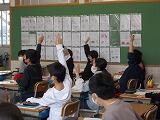 1年生の算数の授業では,時計の学習です。「教室の時計は何時何分ですか?」と先生が訊くと,細かい目盛まで必死に読んでいました。生活に直結する学習です。