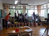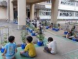 2年生が自分の植木鉢で育てている夏野菜の観察をしていました。花が終わって実ができる時期です。「もうキュウリができているよ!」「緑色のトマトがたくさんある!」といった発見がたくさんあります。大事に水やりをするとグングン育つ夏野菜には,学びがたくさんあります。