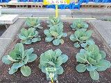 校舎の中庭には,たくさんの草花や野菜の苗が育っています。特に大きくて目を引くのは,下の写真です。なんの野菜かわかりますか?