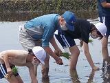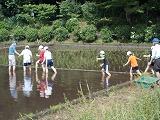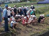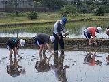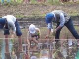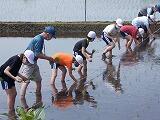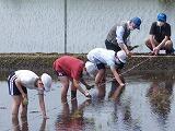 1グループ6人ぐらいが水をはった田に裸足で入りました。泥の感触が刺激的だったようです。事前に教えていただいたように3本ひとまとめにしながら苗を植え付けていきました。足元が落ち着かない上に,苗が思うように立ってくれないので,難しい顔をしながらも,真剣に取り組んでいました。