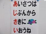 一つ目は,「あじさい」の話。といっても花の話ではなく,「あじさい」を頭文字にした「あいさつは じぶんから さきに いおうね」という挨拶励行の話です。そして,6月は,「あじさいプロジェクト」として,自分から挨拶することをがんばろう!と呼びかけました。下の作品は,「なかよし学級」の児童が作成しましたものです。