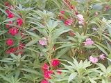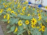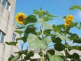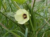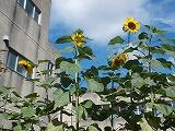 中庭の花壇には,オクラの花が咲いています。横には立派な実もつけています。真夏にぴったりのヒマワリと一緒に夏の日差しを満喫しているようです。