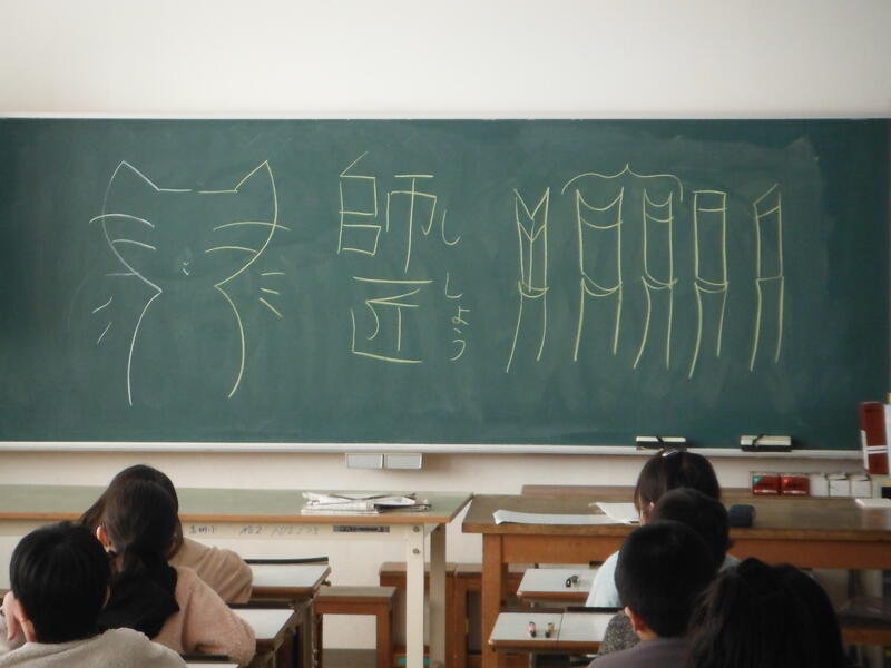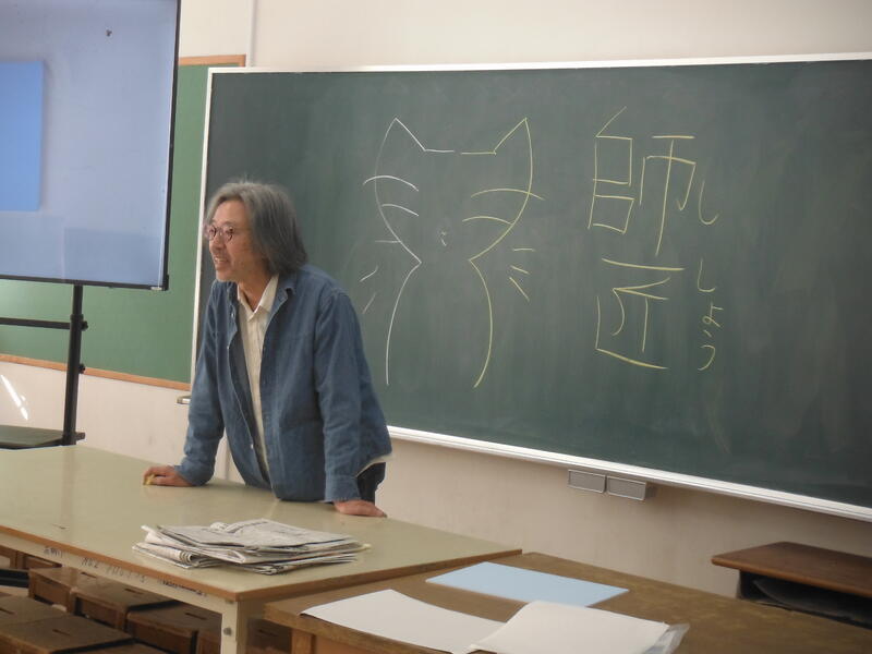 初めての彫刻刀でちょっと緊張気味。師匠の挨拶がわりのネコの絵は,両手で描いてくれました。