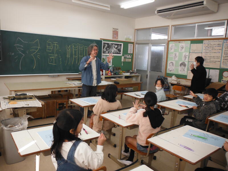 ネコの版画がとても有名です。学校にも,校長室にも作品がありますから見つけてみてください。