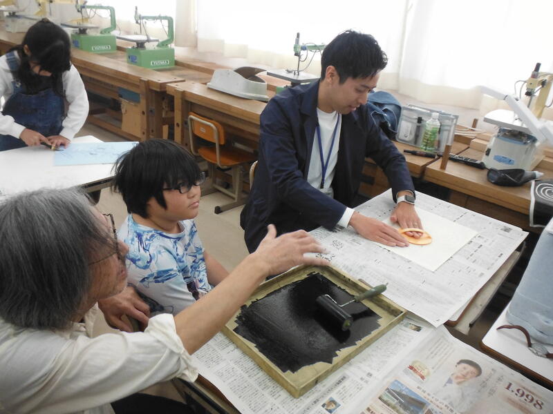 版画の刷り方も実演して頂きました。担任の先生もやってみました。