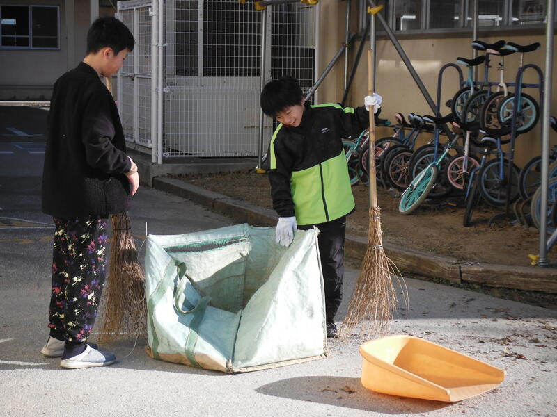 校庭の落ち葉を手分けしてみんなで集めました。教頭先生・川西先生・佐藤用務員さんも参加してくれました。