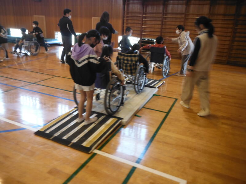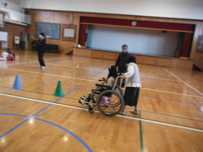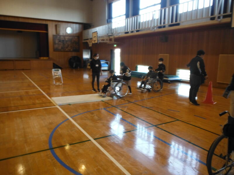 社会福祉協議会の方々やボランティアの方,高柳地区社協の方々のご協力で車いす体験をしました。