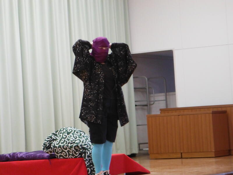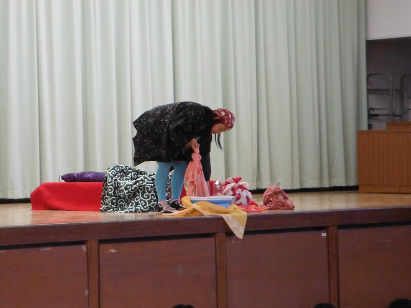 静御前さん 風呂敷が変身しました。最後はお水を入れてもこぼれませんでした。手品のようでした。