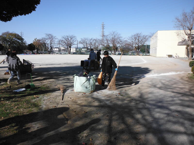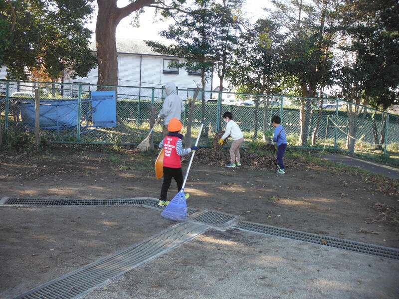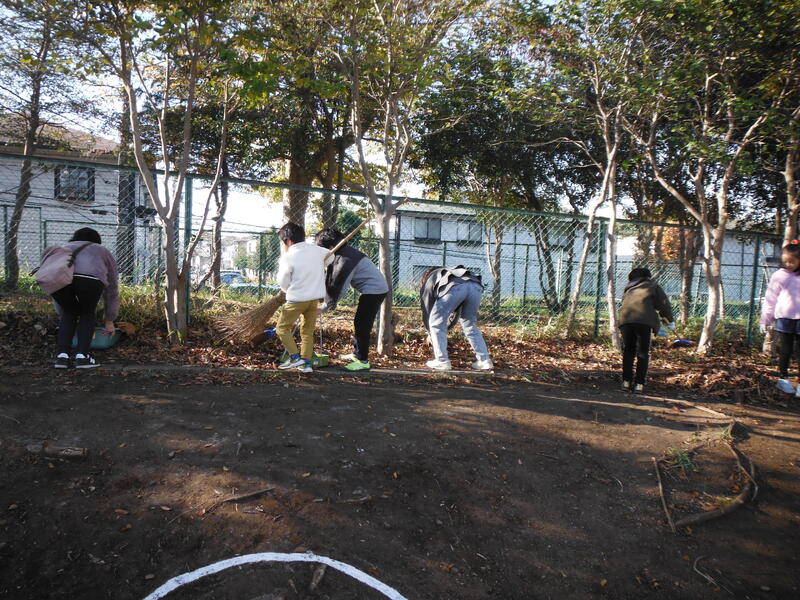 校庭の落ち葉を手分けしてみんなで集めました。教頭先生・川西先生・佐藤用務員さんも参加してくれました。