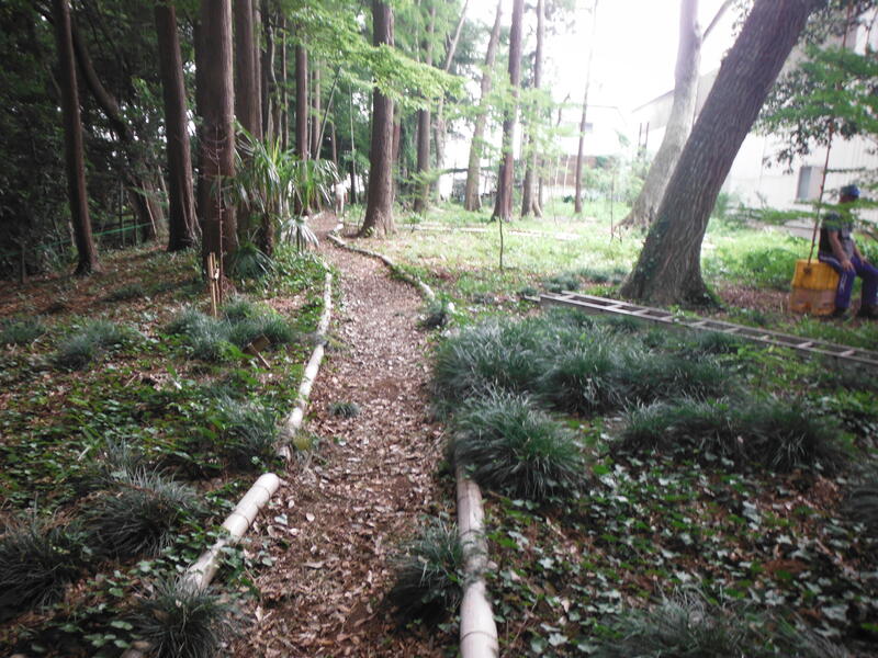 竹で散策道を整備してくださいました。歩くとふかふかしています。「どうしてふかふかしているかわかる?」