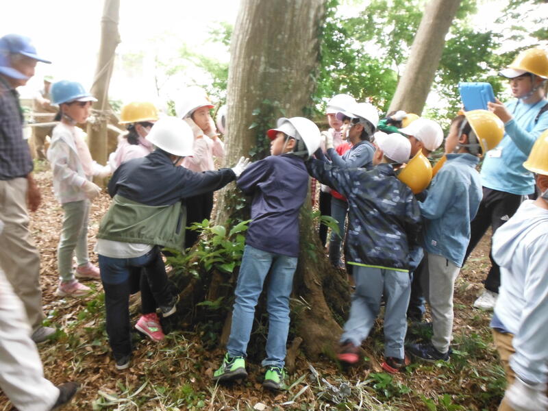 「この木はこの森の中で一番太いよ」「何人で囲めるかな」