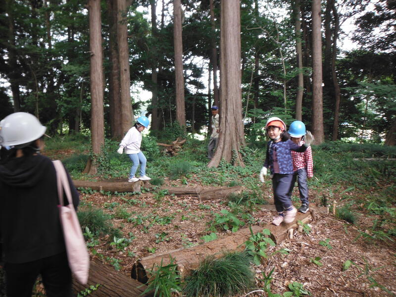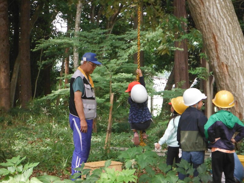 地域の方の手作りの遊具で遊びます。楽しい!!のこぎり体験 ターザンロープ ロープ渡り 丸太の平均台 など。