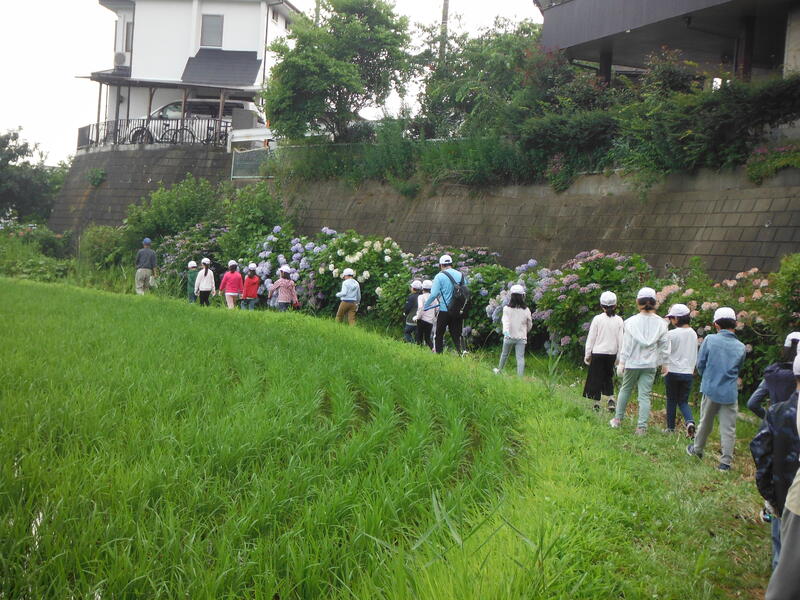 サギソウの畦道を通りました。アジサイが綺麗でした。樹々や植物の説明をしてくださいました。実際に川に入り,