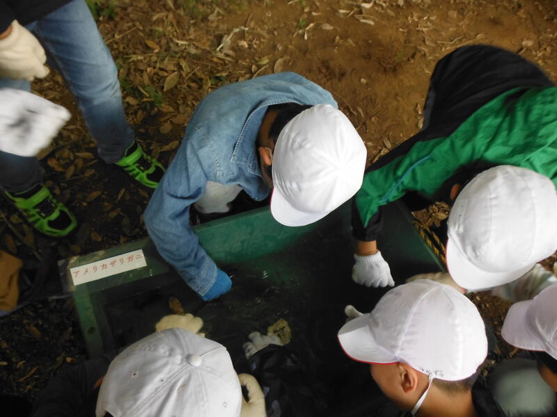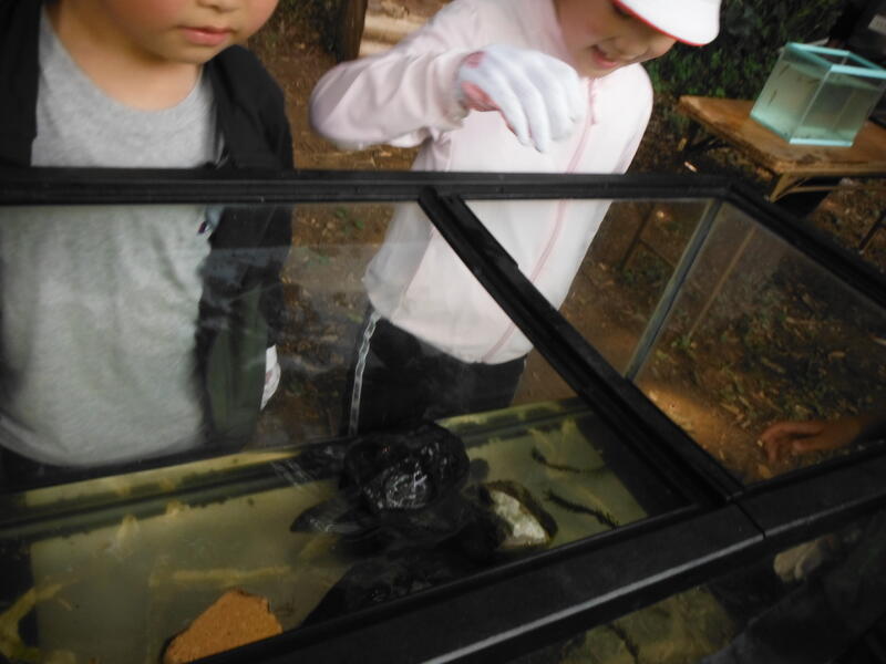 ザリガニや魚を捕まえてくれました。ザリガニやかめ,ドジョウ,川魚,かぶとむしの幼虫などが見られるように展示して