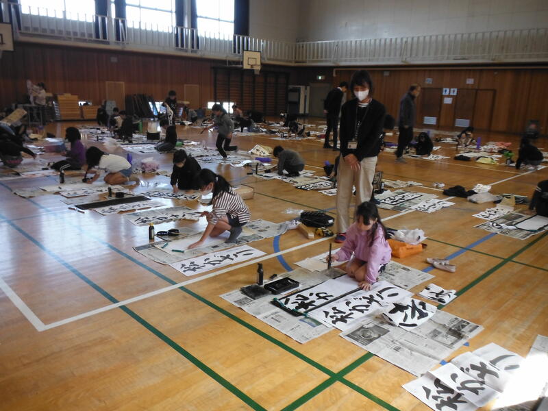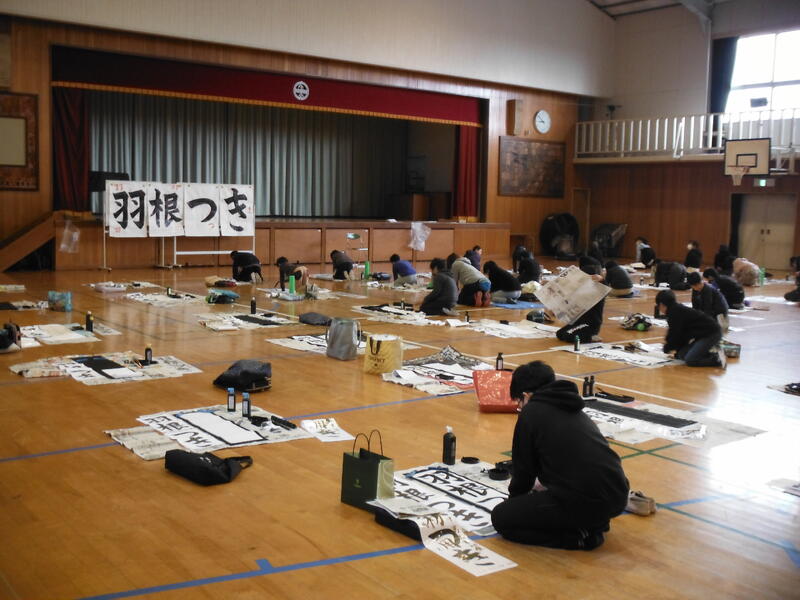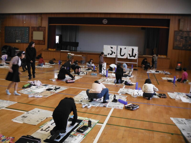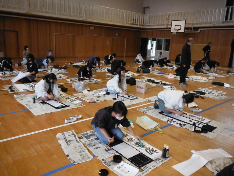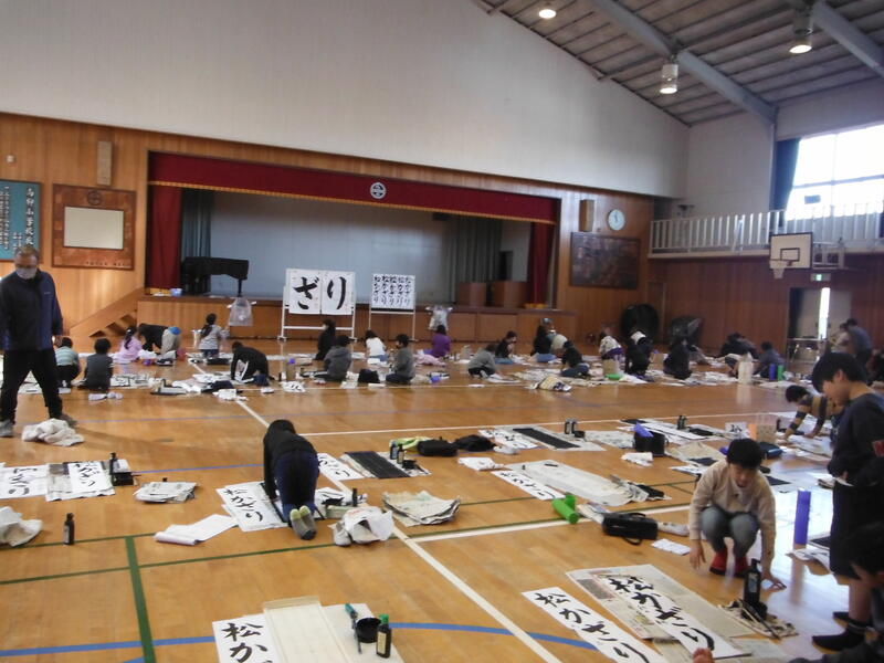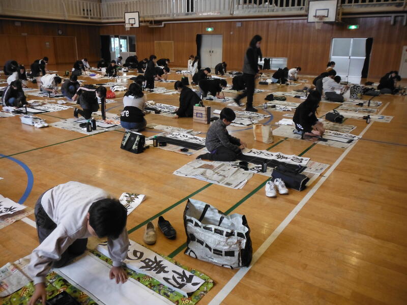 体育館を使って書き初め練習を行いました。今年も綾部先生にご指導を頂きました。