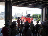 消防署では,消防士の方が実際の防火服を着てくれたり,はしご車の上から放水している様子を見せてくれたりしました。
