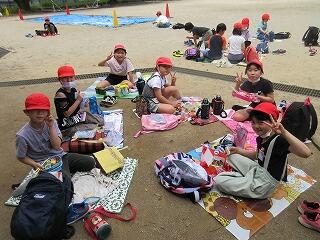 市内をめぐり,校庭でお弁当を食べ