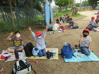 市内をめぐり,校庭でお弁当を食べ