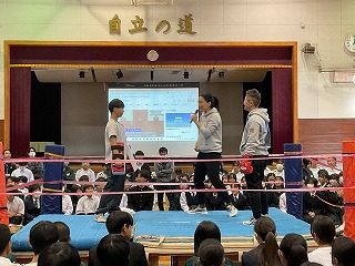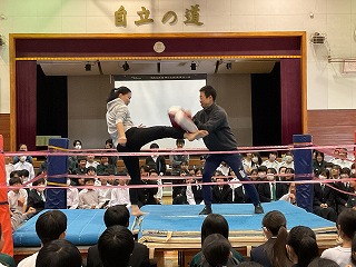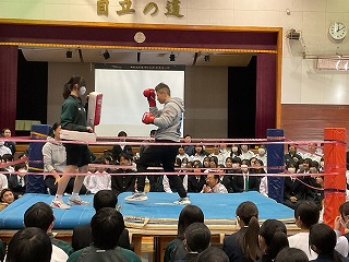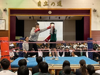 講義の後半では、ボクシングの体験コーナーも実施。各学年の代表生徒が藤岡さんのパンチを実際に受け、そのキレと迫力に会場からは大きな驚きと歓声が上がりました。
