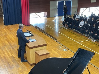 2学期の終業式が体育館で行われました。式では各学年の代表生徒から2学期の振り返りの言葉があり、それぞれの成長や努力、思い出がまっすぐ語られました。続いて校長先生からのお話があり、生徒たちは真剣な表情で耳を傾けていました。