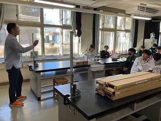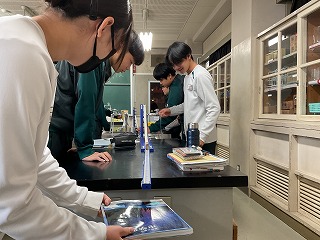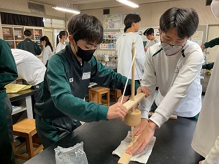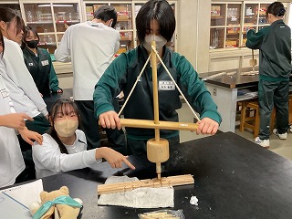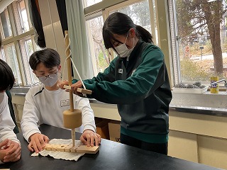 3年C組理科 運動とエネルギーの単元で実験を行っています。運動エネルギーを熱に変換するために、木材同士の摩擦を利用し火起こしに挑戦。苦戦しながらもコツをつかみ始めた生徒たちは、じょじょに煙が立ち上ると歓声をあげていました。