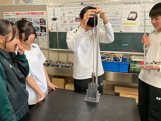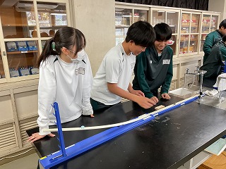 3年理科 位置エネルギーの実験です。高さや重さを変えることでエネルギーが変わることを確認しています。
