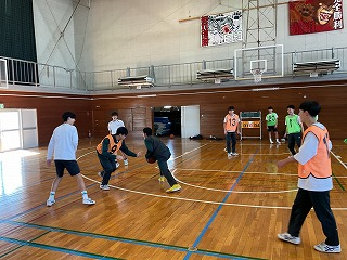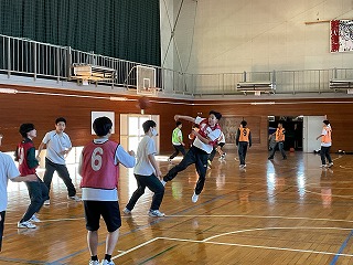 3年体育 男子のバスケットボールは、クラス対抗の試合を行っています。チームメイト同士で声を出し合い協力してゴールを目指す、そんな熱いスポーツの様子が見られました。