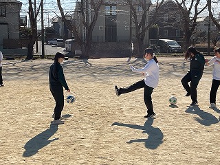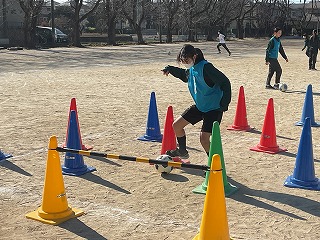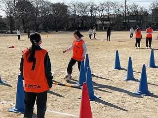 女子はサッカーです。コーンをかわしながらドリブルし、シュートを決める練習です。足元で器用にボールを運び、最後に力強くシュート。ゴールのコーンも倒れるほどの威力に驚きました。