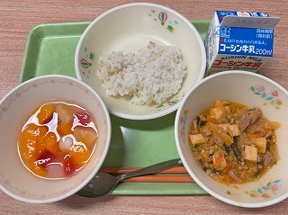 今日の給食は、みんなが大好きなチキンカレーと爽やかな海藻サラダという相性抜群の組み合わせとなりました。