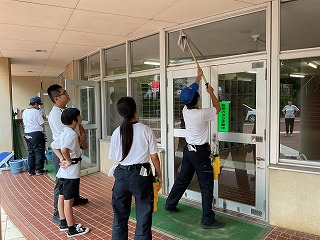清新分校の生徒たちが高柳中を訪れ、清掃活動を行ってくれました。昇降口の窓を一生懸命掃除する姿が見られ、学校の入り口が一段ときれいになりました。