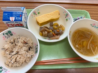 今日の給食は、和の滋味をたっぷり味わえる献立でした。厚焼き玉子、秋野菜の煮物、ひじきごはん、沢煮椀と一つ一つが落ちついた味わいながらも、組み合わせることで豊かな給食となっていました。