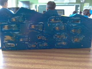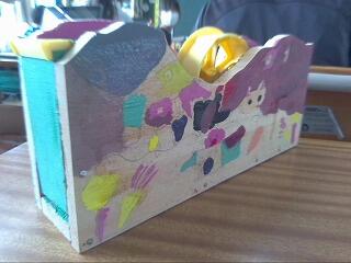 図工の時間で作ったテープカッターです。糸ノコや彫刻刀、絵の具を使って作りました。上の写真のテープカッターは、魚が泳いでいる絵が書かれています。糸ノコでテープカッターの板を切って、波の形にしました。でも波の部分は失敗しました。別の児童の作品では、空の上らしきものを作りました。5年3組 情報委員会