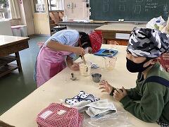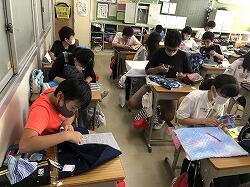 「次はここに通すんだよ!」「こんな持ち方をするとやりやすいよ!」というアドバイスをお互いにしながら,着々とミシンマスターへの道をかけ上がっていきます。また,今週はミシンボランティアの保護者の方にもご協力いただき,コツを聞いたり,見本を見せていただいたりしながら取り組んでいます。