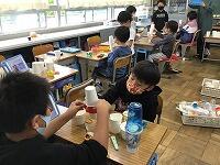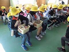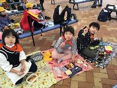 ・昼食…初めて学校の外で食べる昼食。おうちの方が作ってくれたお弁当をおいしくいただきました。今朝は早くから準備をしていただき,ありがとうございました。