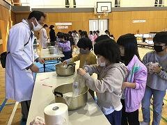 色のついたエプロンをかぶり全校児童で写真を撮りました。