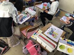 ・3年生…「にじんで広がる色の世界」という題材です。クレヨンで描いた線の上に絵の具で着色します。色がにじんでいく様子を楽しみながら,作品を完成させていました。