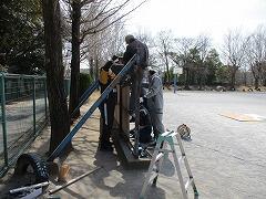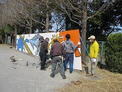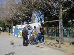 PTAと高田町会,ちば里山トラストの会のみなさんが,投てき板の取り付けをしてくださいました。
