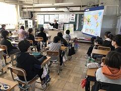 今日は,JICA(国際協力機構)のシニアボランティアをされていた影山洵先生をお招きして,海外での体験について6年生向けに出前授業をしていただきました。影山先生は貿易商社で30年輸出入のお仕事をされた後,発展途上国に日本の技術者を派遣する活動をしていたそうです。訪れた国は約30。豊富な海外での経験について説明していただきました。