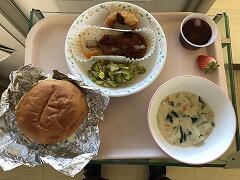 なんと選択式です!Aメニューは「セルフオムライス,タンドリーチキン,チョコプリン」,Bメニューは「ハムとチーズのホットサンド,たらの香草焼きトマトソース,グレープゼリー」の二つから,自分が好きな方を選びました。さらに,共通の献立として,エビフライとシーザーサラダ,クリームポタージュ,いちごがつきます。