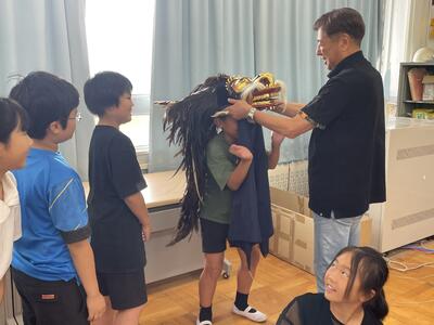 をもって話を聞いたり,獅子舞をかぶったりしていました。